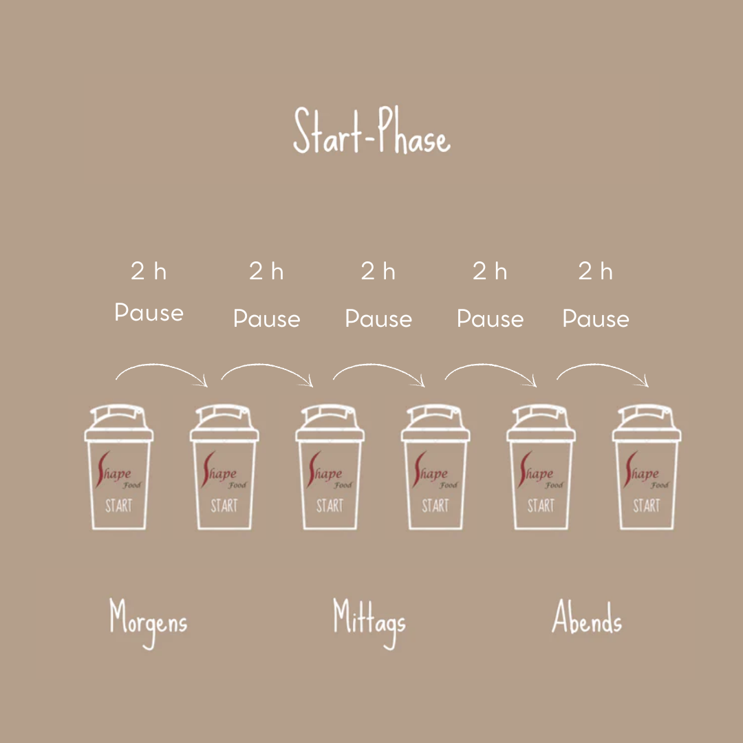 The start-up phase lasts 2 days . Shapefood Start is taken 5 times a day , 3 hours apart. You should not eat anything during these 3 hours. Non-caloric drinks such as water, unsweetened tea and black coffee are allowed.