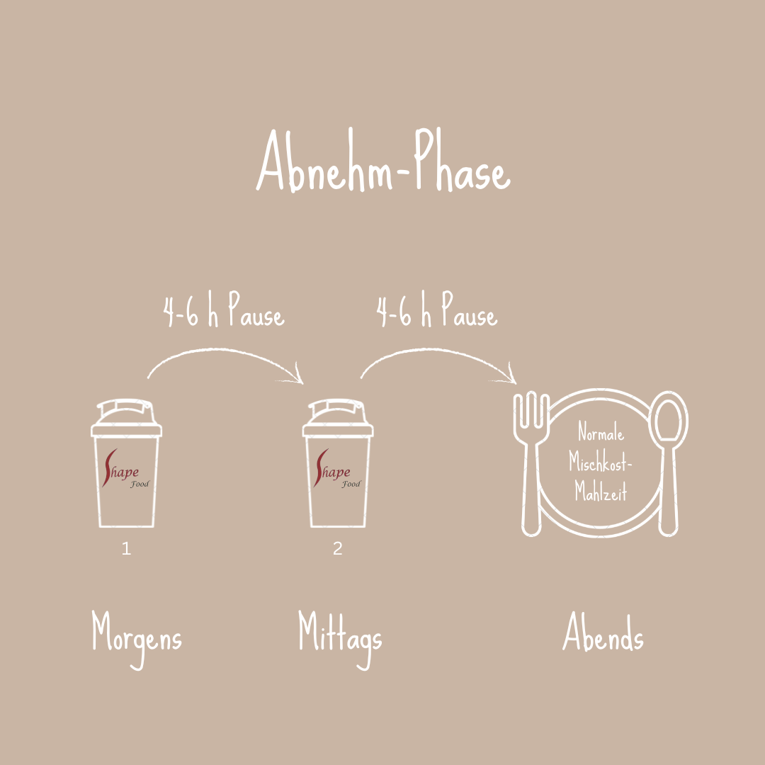 During the weight loss phase , you replace 2 meals with shape food and eat a normal mixed food meal (see graphic). You should not eat anything for 4-6 hours between meals. Non-caloric drinks such as water, unsweetened tea and black coffee are allowed.